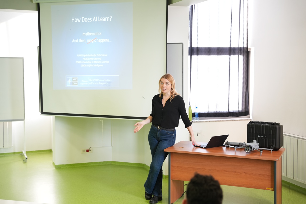 Vanredna profesorica dr. Özge Büyükdağlı održala je predavanje pod nazivom „Uvod u umjetnu inteligenciju za detekciju dronova”, sa fokusom na primjeni umjetne inteligencije u odbrambenim sistemima, savremene prijetnje dronovima i značaj rane detekcije. U okviru NATO SPS projekta Ai4CUAV, učesnicima su predstavljeni praktični rezultati i primjene iz stvarnog okruženja, koje je podijelio projektni tim, uključujući studente Asju Basović, Ismeta Ozana Karabinara, Kayru Yılmaza i Sebahattina Sarala.